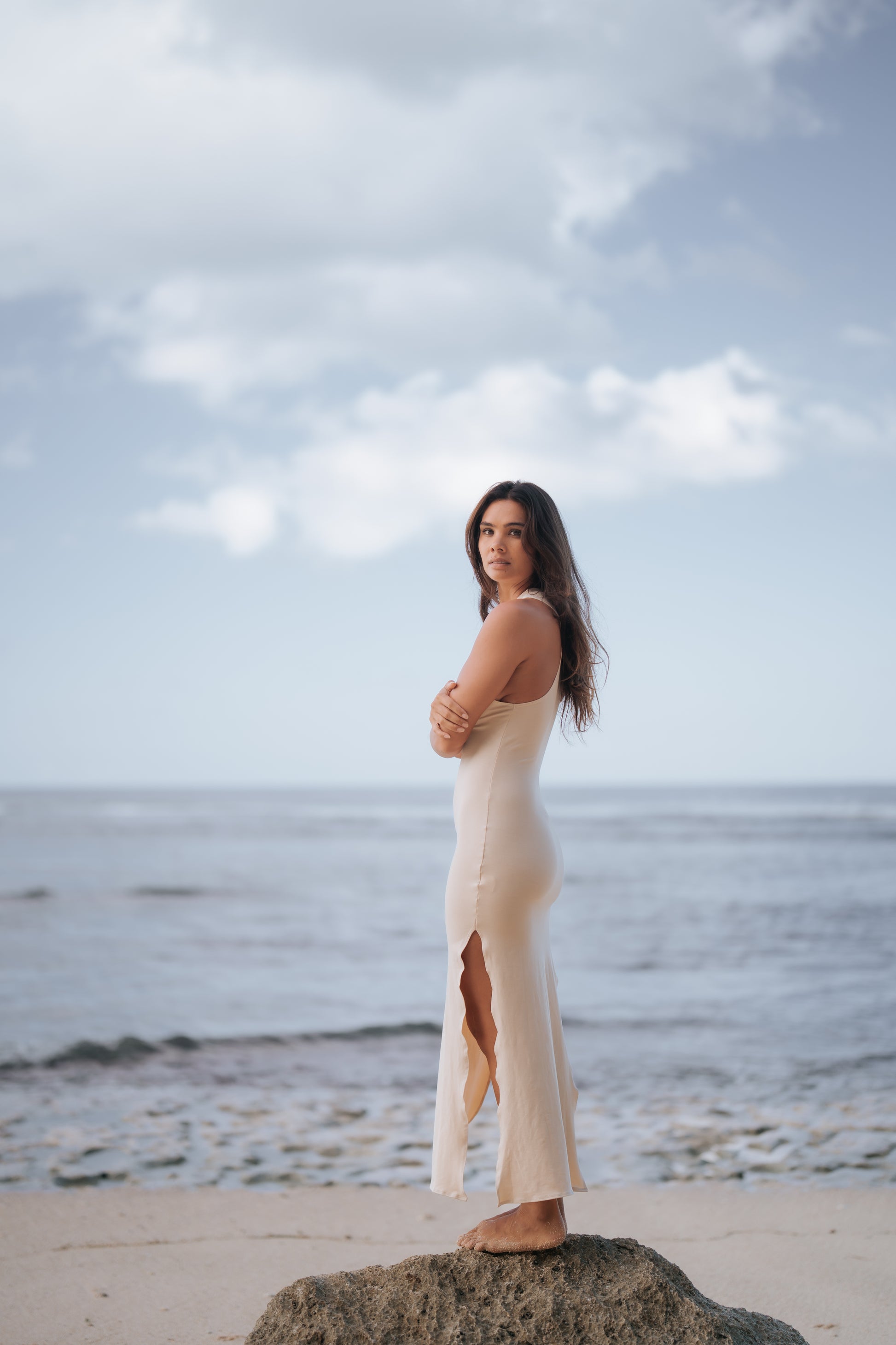 Designed with comfort and adaptability in mind, this dress features a stylish side splits. Available in sizes S and M, it’s ideal for any occasion, whether you’re taking a leisurely beach walk or attending a summer event. Enjoy the soft, breathable feel of bamboo satin on your skin and experience the perfect mix of comfort and elegance.
