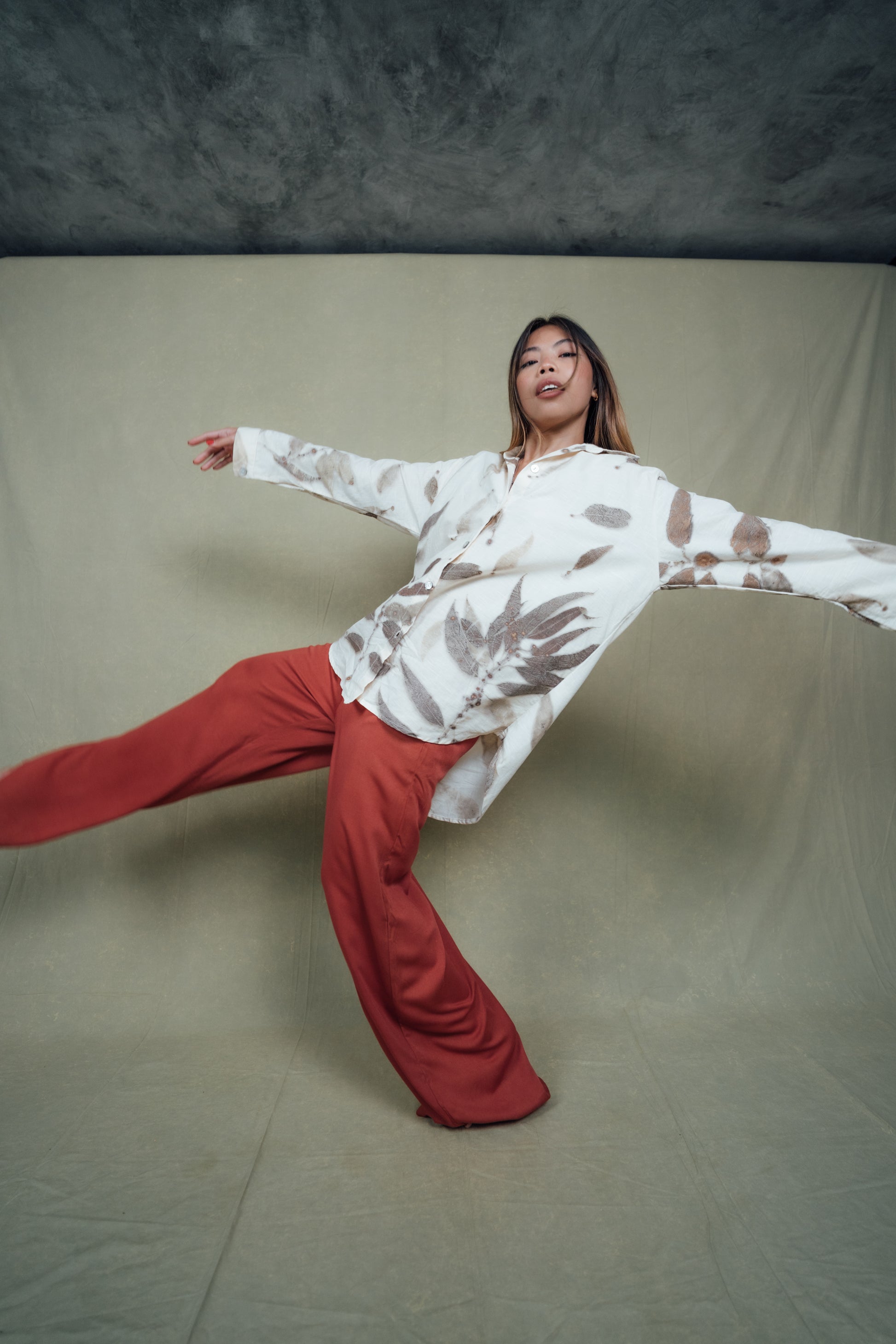 Nature leaves its mark in the Terra Shirt, an ode to slow fashion and botanical artistry. Made from pure cotton and printed using real leaves and flowers through eco-printing techniques, each shirt carries its own unique pattern no two are alike. Available in two relaxed sizes (SM and ML), it’s designed for an easy, unisex fit with a soft drape and subtle structure. Wear it open as a lightweight layer or buttoned up for a crisp yet organic feel.